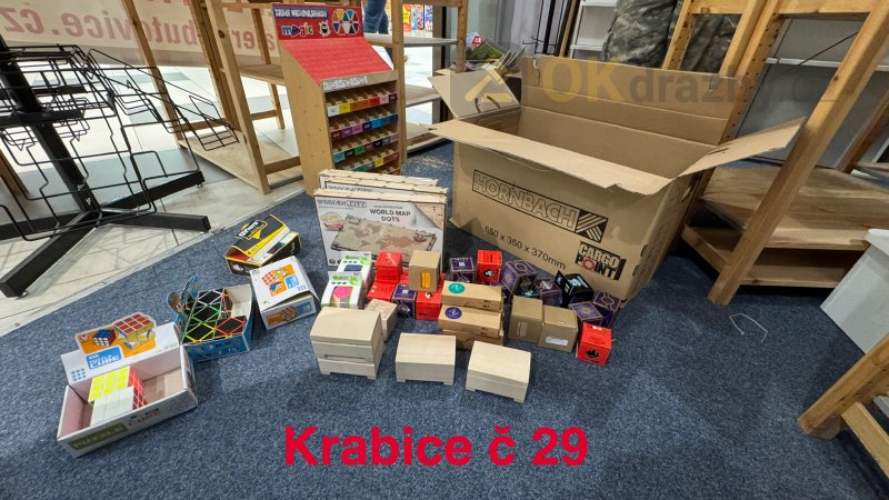 3. Krabice č. 29 ( dřevěná spojovací písmenka a vláčky, dřevěné puzzle, zabavné rubikovy kostky, dřevěné truhly na poklady ) 438ks