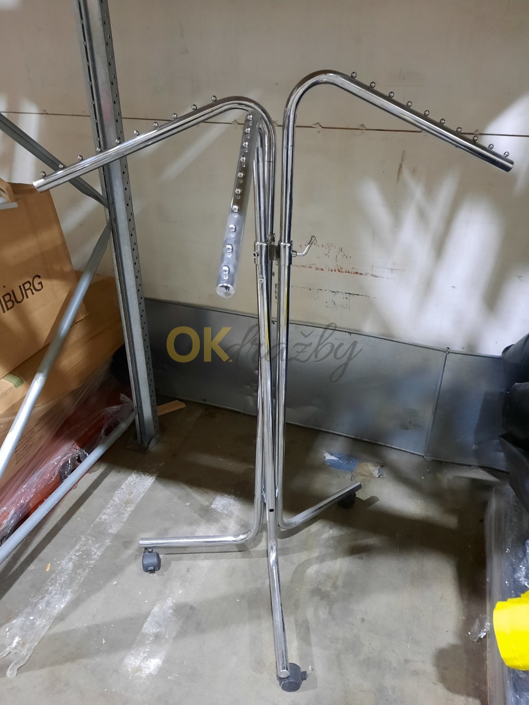 Použité viz foto. Chybí několik zajišťovacích dílů pro nastavení výšky věšáků. Všem zájemcům o položky v dražbě je doporučena prohlídka předmětu dražby. Na použité věci nelze uplatnit vadu odpovídající opotřebení a používání a vady existující v den předání. Výše uvedené položky budou v rámci této vyhlášky nabízeny jednotlivě a níže uvedená ustanovení platí pro každou položku zvlášť. Fotografie v dražbě jsou ilustrační, pro více informací o stavu položky v dražbě volejte Navrhovatele. Vítěz dražby je povinen při převzetí položku z dražby zkontrolovat, že je vše kompletní. Organizátor dražby nezodpovídá za vady předmětu dražby, a to ani za vady zjištěné po podpisu kupní smlouvy, respektive předání položky z dražby. Za tyto vady zodpovídá Navrhovatel dražby. Nelze uplatnit odpočet DPH.