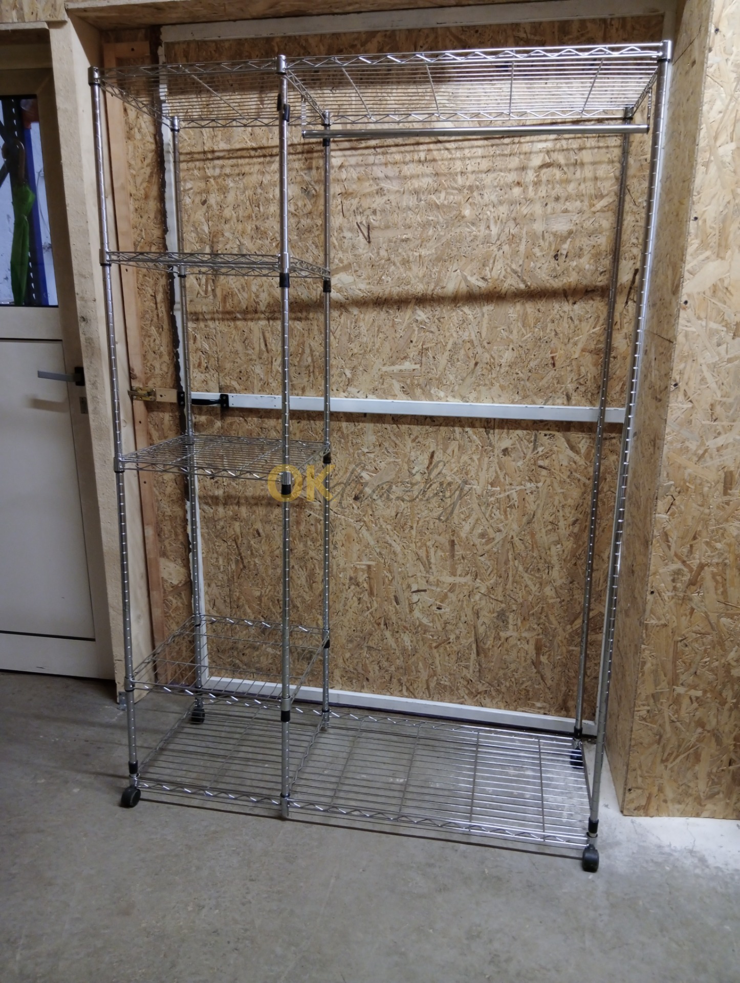 Pojízdný kovový šatní stojan s policemi
